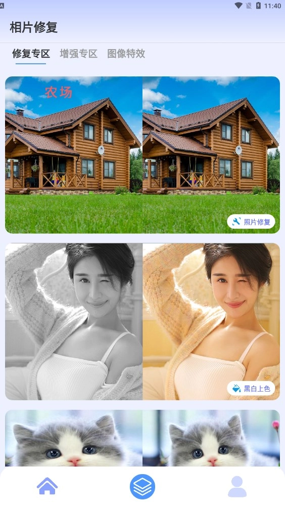 《相片修复》软件具备出色的修复能力,用户可以用它一键修复多年前的老照片,而且修复后不会留下任何痕迹。它能提升低分辨率照片的清晰度,帮助用户顺利完成修复工作,为用户带来诸多便利。此外,软件内还提供了丰富的特效,用户可以体验多种玩法,相信你一定会喜欢。