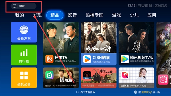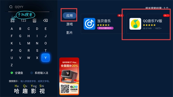 输入关键词后,在搜索结果里选择【应用】分类,就能找到对应的应用,像【QQ音乐TV版】这类的。
