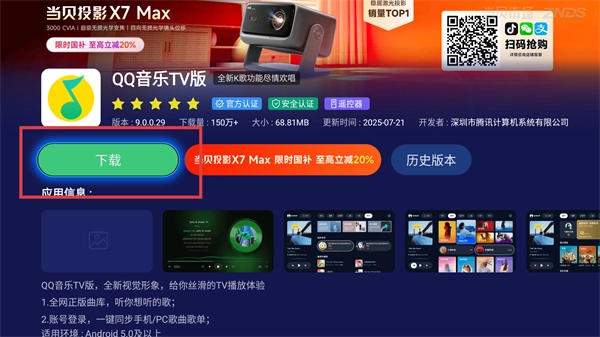 进入【QQ音乐TV版】详情页后,点击【】按钮,即可启动该应用的安装流程,完成后就能使用啦。