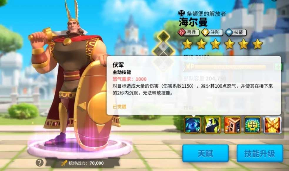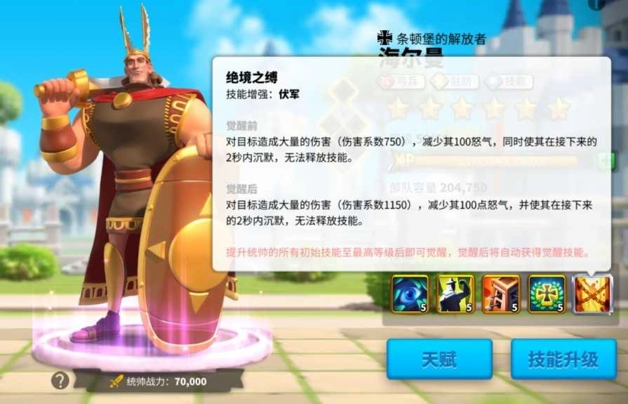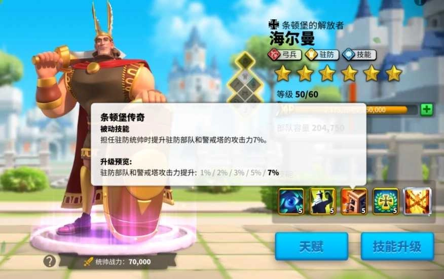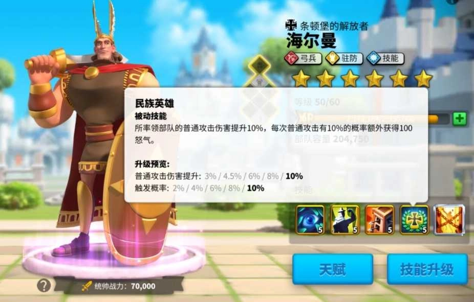 三技能「条顿堡传奇」:能小幅提升驻防属性与攻击输出,属于功能补充类技能。在当前版本中,驻防位置的统帅选择更侧重于生存能力更强、减伤效果更稳定的类型,因此该技能更多是作为过渡期的辅助技能来使用。