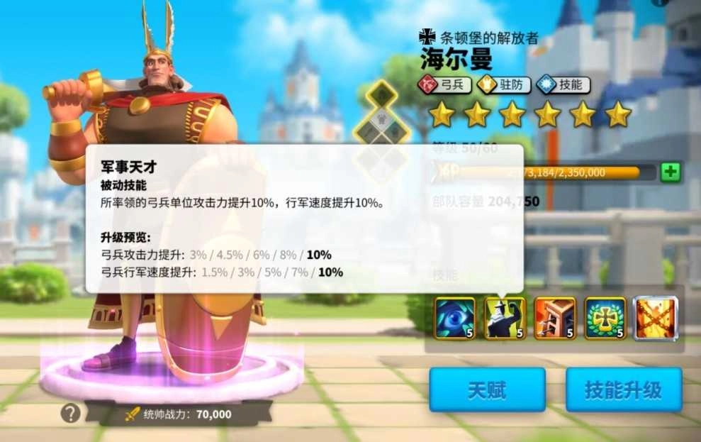 二技能“军事天才”:能直接让所率领的弓兵攻击力和行军速度提升10%,是即时增强战力的增益效果。在需要高速拉扯阵型或是从侧翼切入的战斗场景里作用突出,不过要留意,别和那些成长周期太长的统帅绑定得太死来培养。