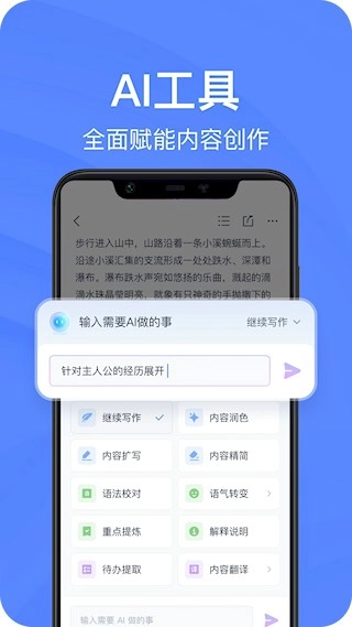 1、AI创作辅助:整合场景辅助功能与内容优化工具,涵盖文章撰写、大纲罗列等多种场景,能够梳理笔记核心要点、润色文字表达,助力用户高效完成内容创作。