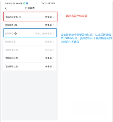 2、若状态显示为“待申请”,请依据指引完成门店认证,并上传所需的相关材料。