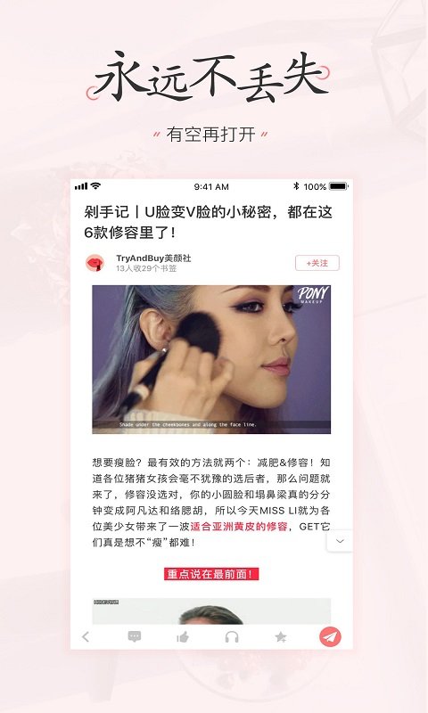 睡前刷微博时刷到个美妆小技巧,难道现在就得爬起来试吗?下班路上刷小红书种草了条好看的裙子,难道现在就得下单吗?当然不!我们都会先把它们收藏起来,然后……就没有下文了。但有了美书签,不管是在微博、微信、小红书,还是头条、抖音、淘宝,甚至其他任何App里看到的好东西,都能统一收藏到美书签里!