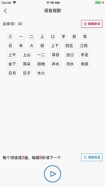 -语音默写功能,通过AI语音播报进行听写,无需家长协助,孩子就能独立完成词语默写任务