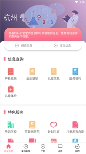 1、第一步是打开母子健康手册,在手册首页能添加自己和宝宝的个人信息,填写完成后就可以查询产检结果、出生证明等内容;