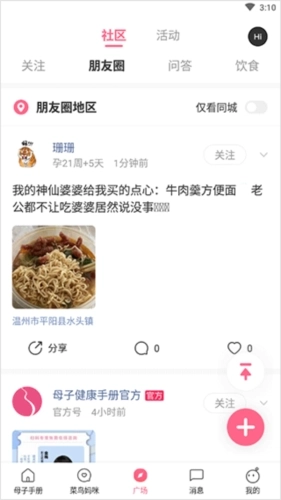 3.社交圈新增了好友关注功能,同时添加了孕妇问答模块与个人主页板块。