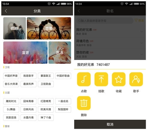 分类点歌服务,精心整合了快乐、伤感、宣泄等不同心情主题的歌单,同时涵盖各大卫视节目歌曲、欧美风情、日韩风尚、民歌悠扬等特色分类。只需轻轻一点,就能让你随时唱出独特风格!
