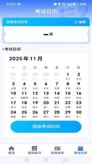 4、在考试日历页面,可手动添加个人考试时间,并支持倒计时提醒功能。