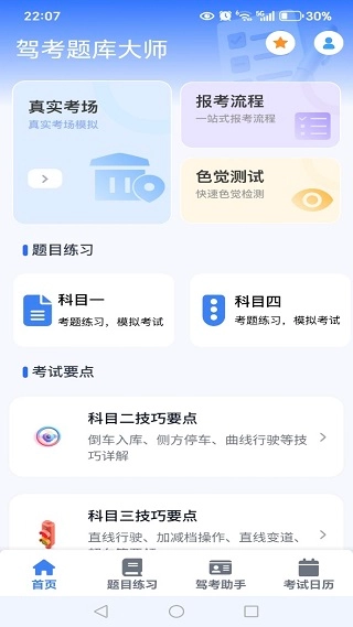 1、首页设置了真实考场、报名流程、色觉测试、题目练习、考试要点等板块。