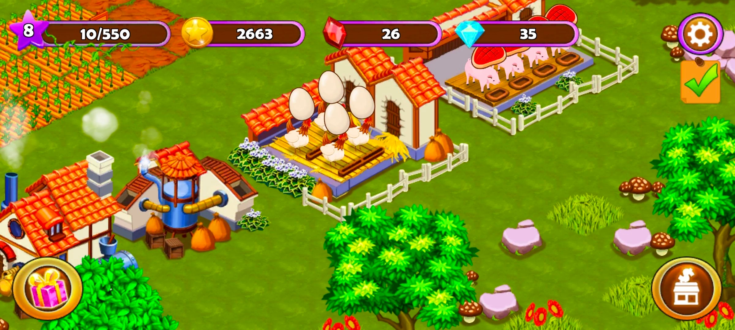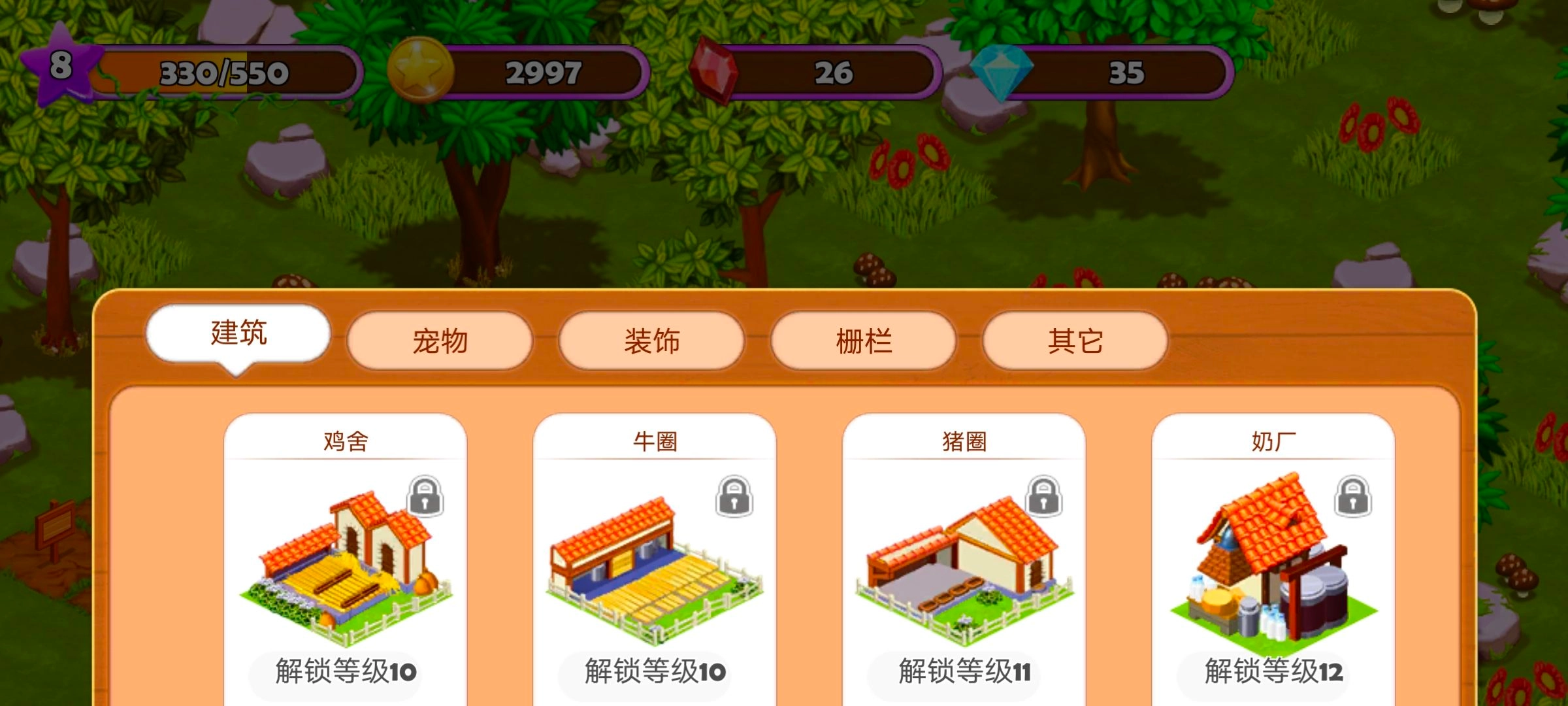 3、用心经营你的农场,饲养各类鸡鸭牛羊,栽种花果蔬菜。
