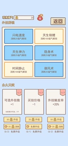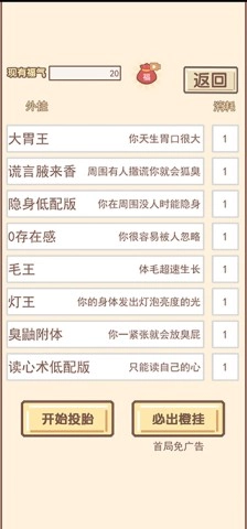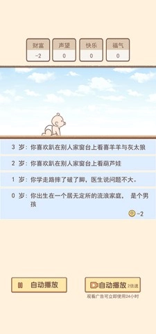 每一次选择,都能带来别样精彩。开局时,你需要挑选自己心仪的三种外挂,像超能力、出生于富贵家庭,亦或是刚出生就能说话等。同时,合理配置财富、声望、福气、快乐等属性也至关重要,因为这些会影响你未来每一岁的人生经历,助你塑造独一无二的人生旅程。