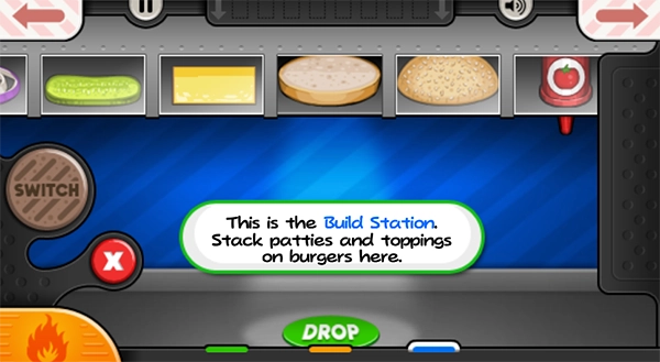 3、走到制作台开始制作汉堡,依照页面右侧菜单的要求,按顺序放入食材。