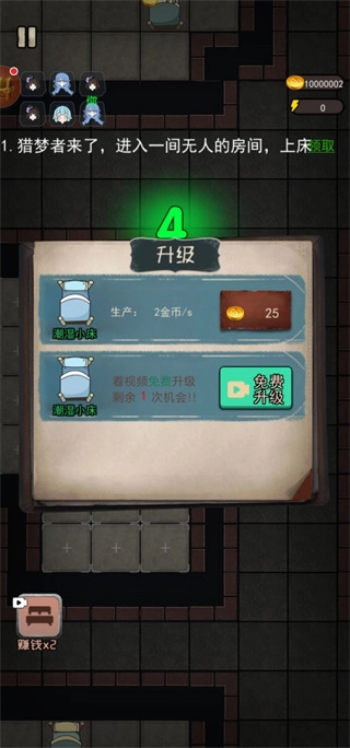 进入宿舍后,首要任务是提升床铺等级,以此来快速积累金币,这是后续开展建设与防御工作的重要前提。
