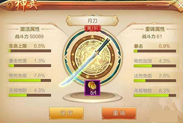 神武每次升级都会获得一个“祝福点”,当祝福点累积到上限时,就能提升等阶。每提升一阶,玩家都会获得额外属性,总共分为4阶:第一阶解锁生命上限,第二阶解锁法术防御,第三阶解锁暴击伤害,第四阶解锁法伤免疫。每一阶的神兵都拥有独特外形可供幻化,效果类似时装皮肤。此外,若玩家对神兵当前属性不满意,还能通过重铸功能随机刷新属性,重铸后可以一直保留当前属性,直到刷出满意的效果再进行保存。