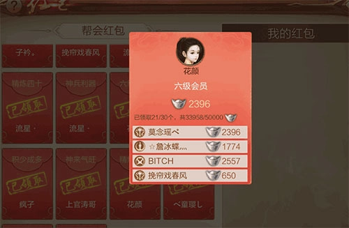 可以养成这样一个习惯:每天上线后,第一件事就是去帮会里看看有没有红包,慢慢积累下来也是一笔不小的收获呢,HOHO。