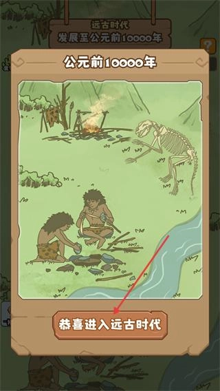 1、当界面呈现公元前10000年的场景时,点击恭喜进入远古时代按钮,正式开启远古时代的游戏发展进程。
