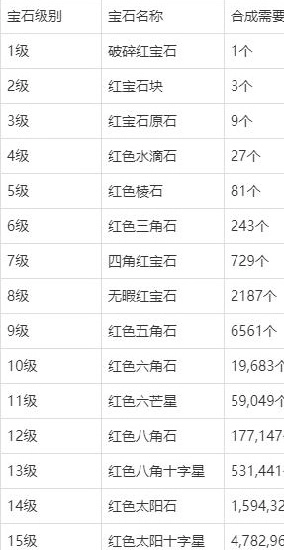 宝石等级设定:宝石共分为15个等级,每3颗低一级的宝石可通过铁匠铺的锻造系统合成为高一级的宝石,合成成功率为100%。以红宝石为例,下面列出15个等级宝石的具体名称,以及合成对应等级宝石所需换算成1级宝石的数量(好奇问一句,3的14次方到底是多大呢?)。