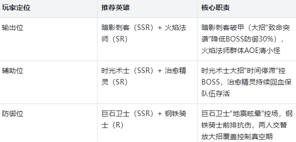 核心作用:深渊猎手(全屏物理AOE,大招“箭雨风暴”清场效率拉满);光翼天使(复活+群体buff,大招“神圣领域”免伤回血);自然贤者(持续治疗+减速控制);圣殿骑士(前排无敌,大招“圣盾守护”抵御BOSS伤害)