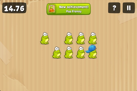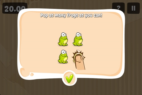 最简单的关卡,就是把屏幕上出现的青蛙戳破,有时间限制,戳破的数量越多得分就越高。我通常是双手一起操作来戳。有些青蛙戴着帽子有防御效果,得先戳掉帽子再戳一次才能成功,有些还会戴安全头盔,需要连续猛戳。这关主要比拼手速,基本没什么技巧可言。