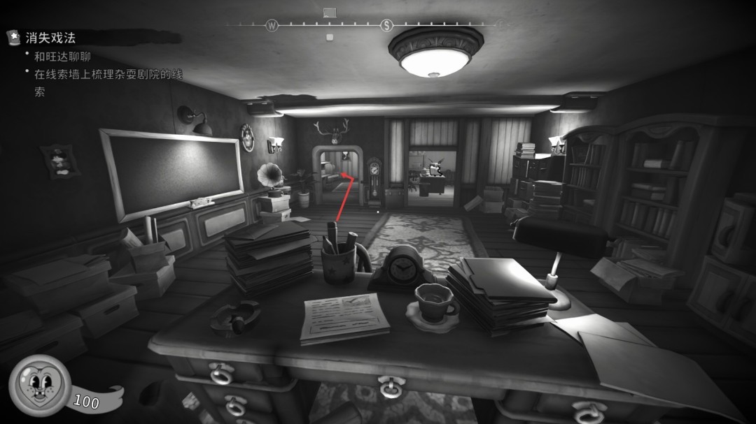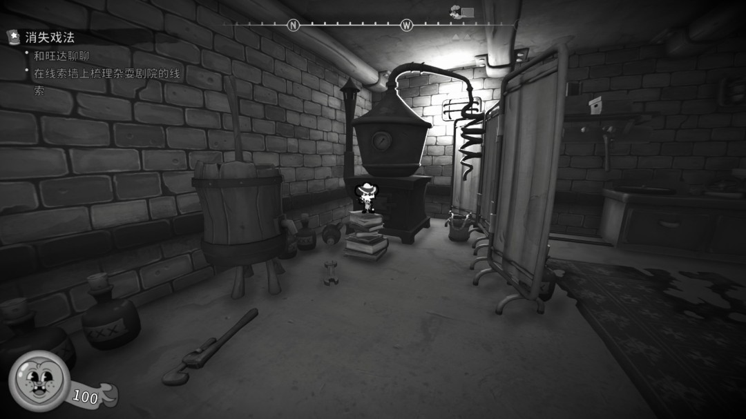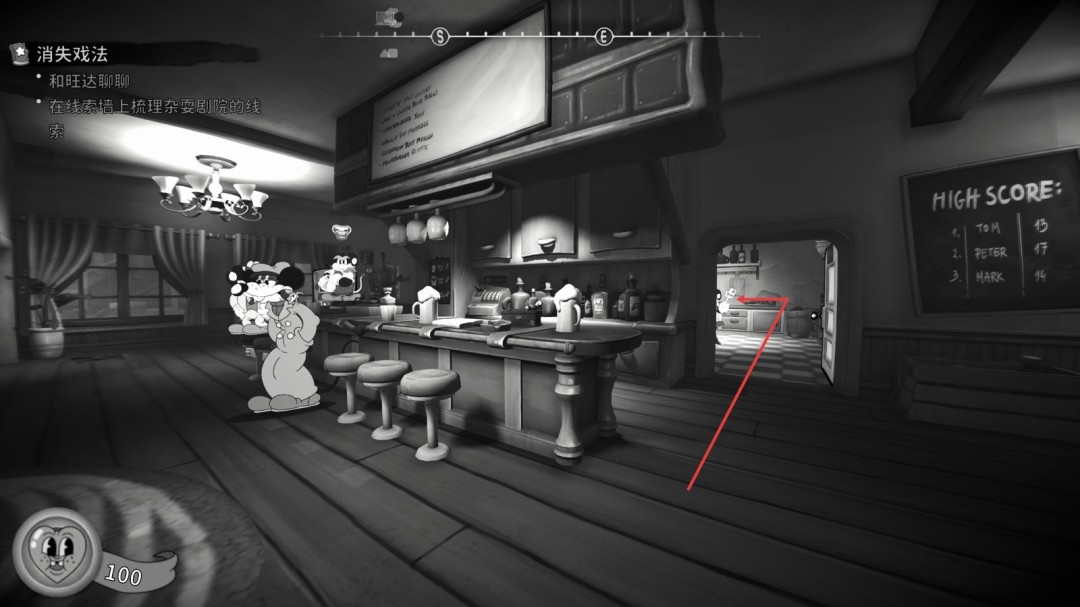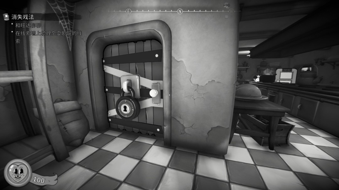 进入酒吧后厨,打开上锁的门,进入地下室,在书堆上。